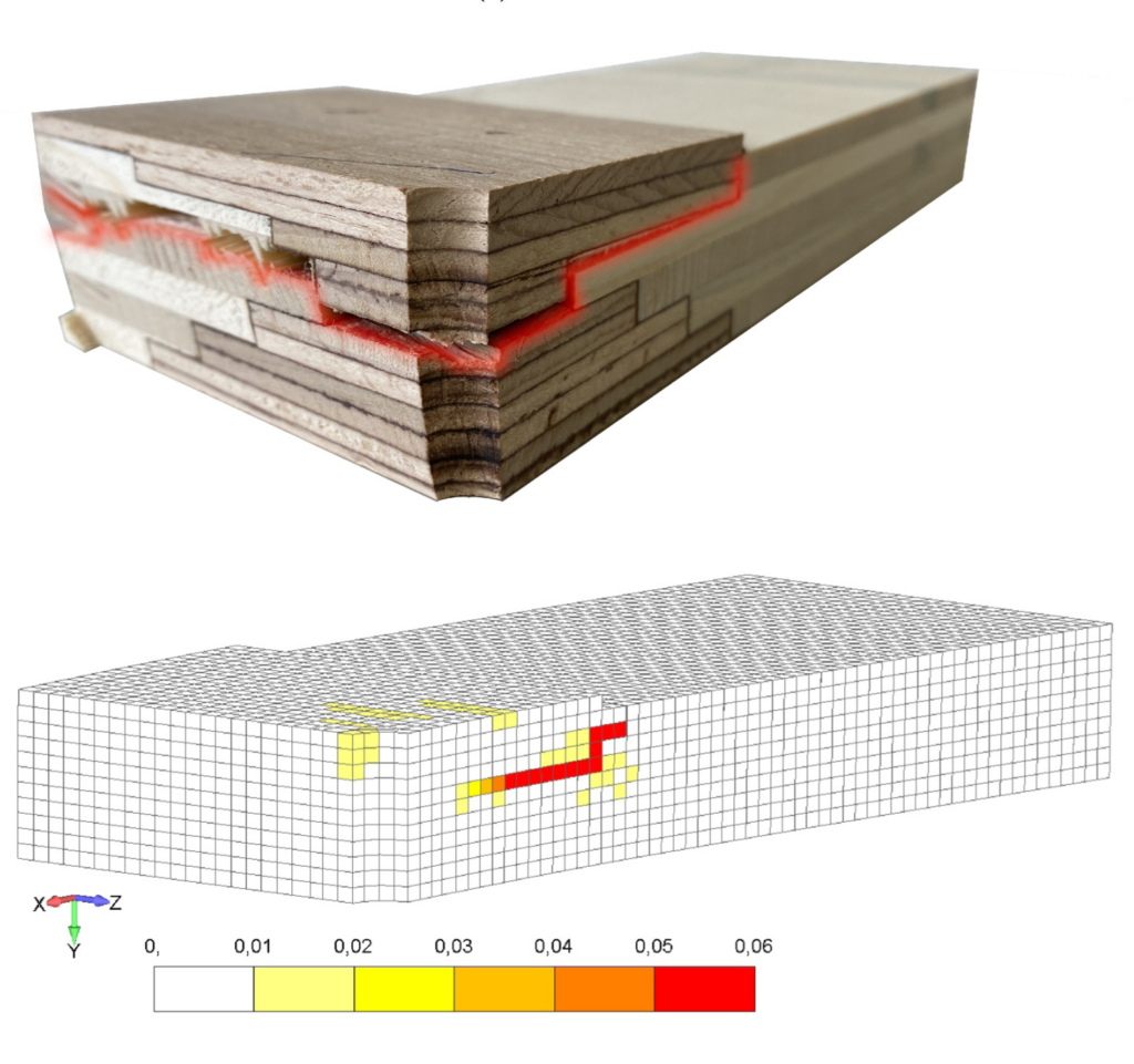 The study investigates a scaled timber–composite column-to-slab connection made of spruce CLT and beech LVL inserts. Experiments and FE simulations show that the scaled model accurately reproduces the failure behavior of the full-scale connection, enabling the use of dimensional analysis to project load capacity from model to prototype. For the numerical work, preprocessing was carried out with Medina, chosen for its speed and the simplicity with which it can generate hexahedral meshes,